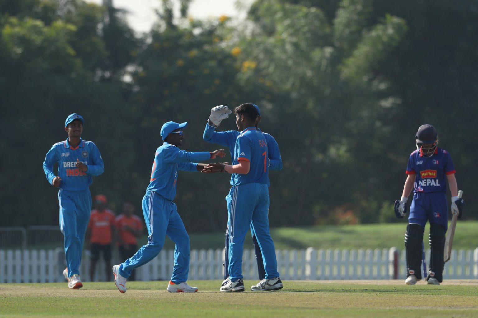 त्यसअघि आइसिसी एकेडेमी ओभल २ मा टस हारेर पहिला ब्याटिङको निम्तो पाएको नेपाल २२.१ ओभरमा ५२ रनमा अल आउट भएको थियो । नेपाललाई सस्तैमा अल आउट गर्न भारतका तीव्र गतिका बलर राज लिम्बानीले सर्वाधिक ७ विकेट लिएका थिए । नेपालका कुनैपनि खेलाडीले १० रन बनाउन सकेनन् । नेपालका लागि हेमन्त धामीले १८ बलमा १ चौकासहित सर्वाधिक ८ रन बनाएका थिए । नेपालले भारतीय तीव्र गतिका बलर सामु रन जोड्न सुरुवात देखीनै संघर्ष गरेको थियो । सिनियर टोलीबाट खेली सकेका दुई प्रमुख ब्याटर देव खनाल २ र गुलशन झा ४ रनमा आउट भए ।