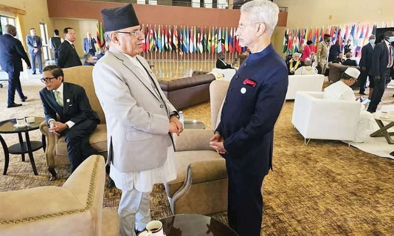 "अफ्रिकी राष्ट्र युगान्डाको राजधानी काम्पालामा आयोजित असंलग्न राष्ट्रहरूको आन्दोलन (नाम) को १९औं शिखर सम्मेलनका क्रममा प्रधानमन्त्री पुष्पकमल दाहाल र भारतीय विदेशमन्त्री डा. एस जयशंकर भलाकुसारी गर्दै । "