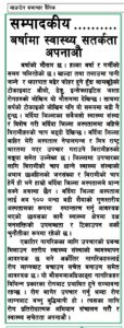 एकातिर नागरिकका लागि उपचारको प्रबन्ध मिलाउन स्तरीय स्वास्थ्य संस्थाको व्यवस्थापन आवश्यक छ भने अर्कोतिर नागरिकहरुलाई रोग लाग्नबाट बचाउन सचेत बनाउन समेत आवश्यक छ । यो मौसममाअधिकाङ्श नागरिकहरु विभिन्न प्रकारका रोगबाट प्रभावित हुने सम्भावना रहन्छ । रोग लागेर उपचार गर्नु भम्दा रोग लाग्नबाट बच्नु बुद्धिमानी हो । त्यसका लागि रोग प्रतिरोधात्मक अभियान संचालन गरौं र स्वास्थ्य सचेतता अपनाऔ ।